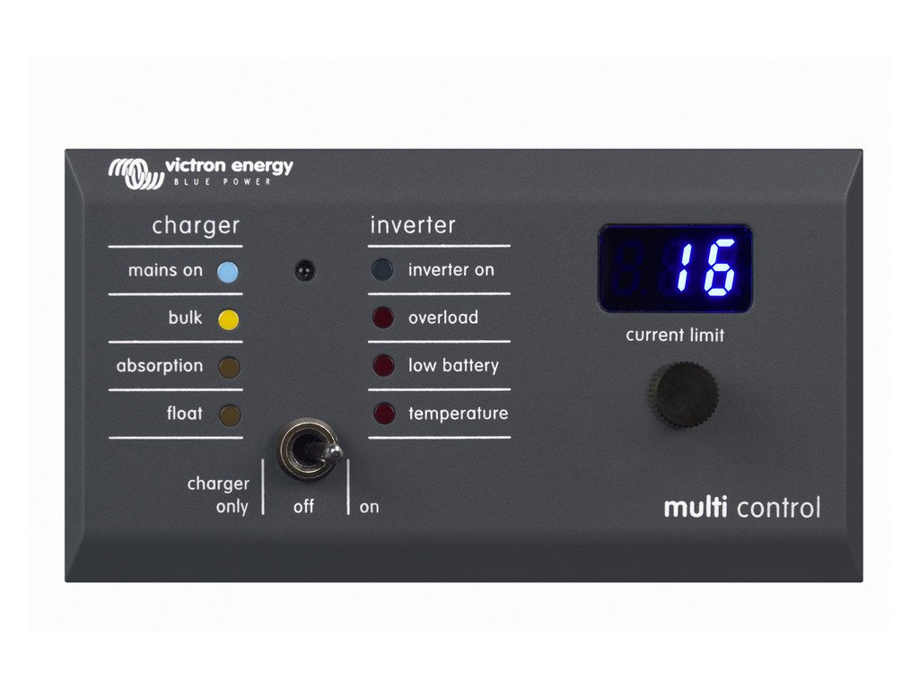 Panel pre vzdialené ovládanie a sledovanie meničov/nabíjačiek radu MultiPlus a Quattro a to v samostatnom, paralelnom aj trojfázovom povoze. Umožňuje páčkovým spínačom vzdialene zapínať a vypínať pripojené zariadenie, prípadne voliť režim „iba nabíjačka“. Ďalej umožňuje meniť hodnotu maximálneho vstupného prúdu zo siete alebo iného zdroja striedavého prúdu. Nastavená hodnota sa trvalo zobrazuje na digitálnom displeji. Panel zobrazuje pomocou LED diód prevádzkový stav. Naľavo sa zobrazuje zapnutie/vypnutie meniča, preťaženie spotrebičmi, nízky stav nabitia akumulátorov a vysoké teploty zariadenia. Napravo sa zobrazuje napojenie na sieť (generátor) a fáza nabíjania akumulátorov. Prepojenie s ovládaným zariadením je pomocou UTP kábla s koncovkami RJ45 (nie je súčasťou dodávky). Panel je určený na vsadenie do steny, elektrokrabice a podobne. Panel má tlačidlo konfigurácie pre individuálne nastavenie. Ďalšie informácie v návode nižšie.
