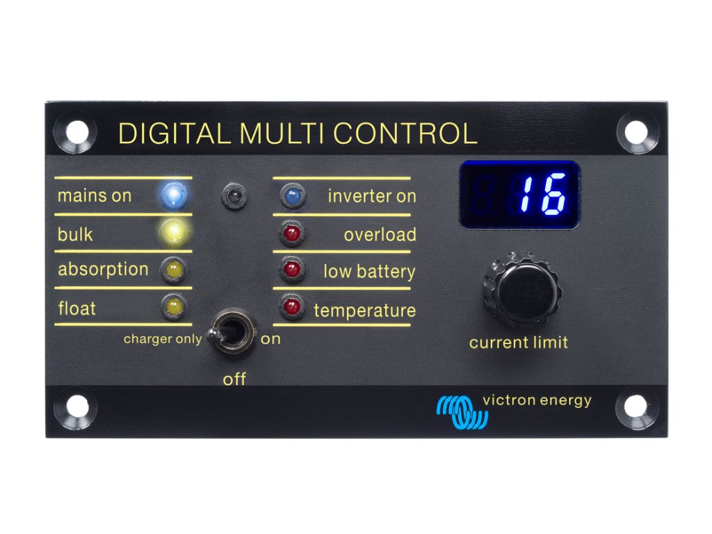 Panel pre vzdialené ovládanie a sledovanie meničov/nabíjačiek radu MultiPlus a Quattro a to v samostatnom, paralelnom aj trojfázovom povoze. Umožňuje páčkovým spínačom vzdialene zapínať a vypínať pripojené zariadenie, prípadne voliť režim „iba nabíjačka“. Ďalej umožňuje meniť hodnotu maximálneho vstupného prúdu zo siete alebo iného zdroja striedavého prúdu. Nastavená hodnota sa trvalo zobrazuje na digitálnom displeji. Panel zobrazuje pomocou LED diód prevádzkový stav. Naľavo sa zobrazuje zapnutie/vypnutie meniča, preťaženie spotrebičmi, nízky stav nabitia akumulátorov a vysoké teploty zariadenia. Napravo sa zobrazuje napojenie na sieť (generátor) a fáza nabíjania akumulátorov. Prepojenie s ovládaným zariadením je pomocou UTP kábla s koncovkami RJ45 (nie je súčasťou dodávky). Panel je určený na vsadenie do steny, elektrokrabice a podobne. Panel má tlačidlo konfigurácie pre individuálne nastavenie. Ďalšie informácie v návode nižšie.